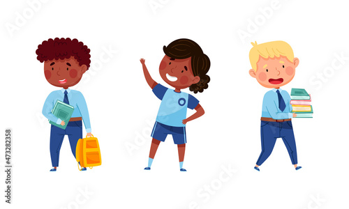 Cute elementary school students in uniform set cartoon vector illustration
