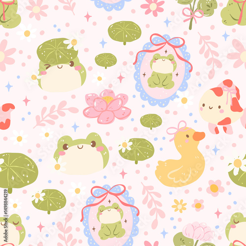 Cute Frog and Duck Seamless Pattern, Kawaii Lily Pad and Lotus Flowers, Pastel Spring Nursery Background