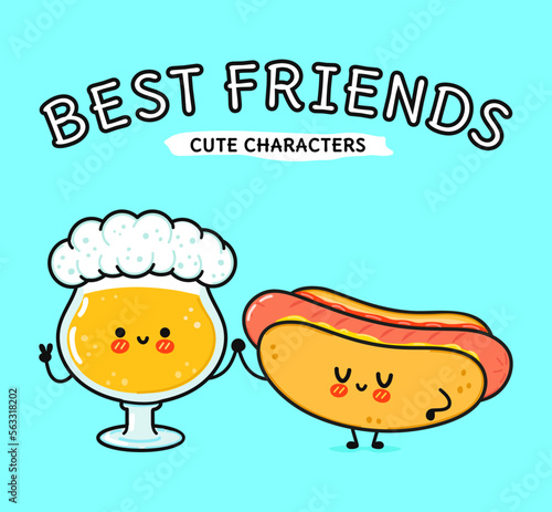 Cute, funny happy glass of beer and hot dog. Vector hand drawn cartoon kawaii characters, illustration icon. Funny cartoon glass of beer and hot dog mascot friends concept