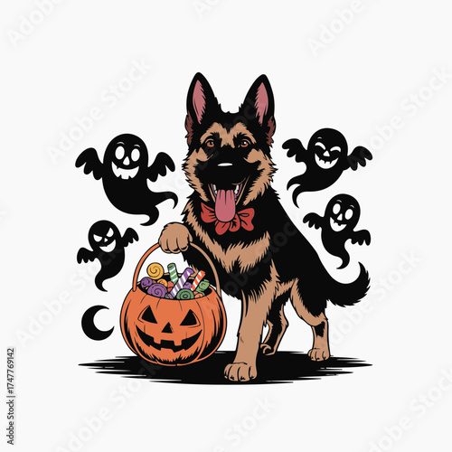 Cute German Shepherd Dog Holding Halloween Pumpkin Basket Full of Candy with Ghosts Around, Funny Pet Illustration for Trick or Treat, Spooky Holiday Vector Art, Perfect for Posters, T-Shirts, Sticker
