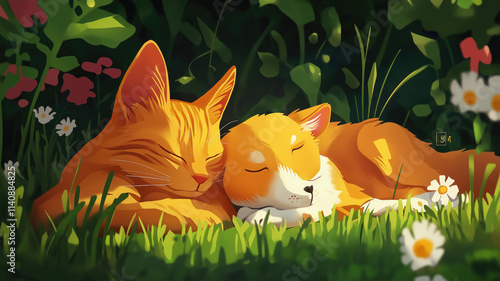 Cute ginger cat and dog sleeping outdoors. Generative AI.