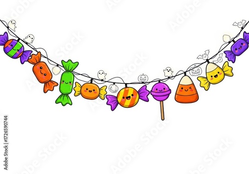 Cute Halloween candy and ghost string lights with pumpkins and bats image