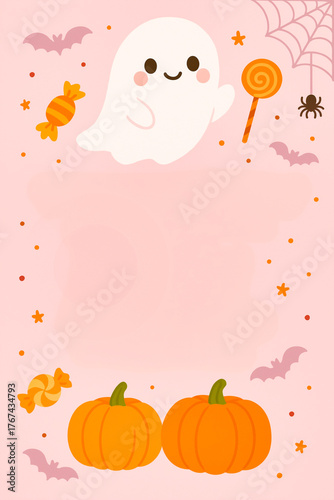 Cute halloween frame with ghost pumpkins candies bats and spiderweb on pink background adorable cartoon design for kids party invitation or decoration