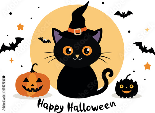 Cute Halloween Illustration Featuring a Black Cat Wearing a Witch Hat Surrounded by Pumpkins and Bats on a