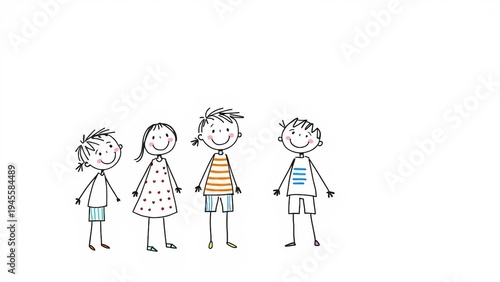 Cute hand drawn doodle children standing together. Simple stick figure style kids illustration isolated on white background, ideal for education, childhood themes, schools, teamwork and playful design