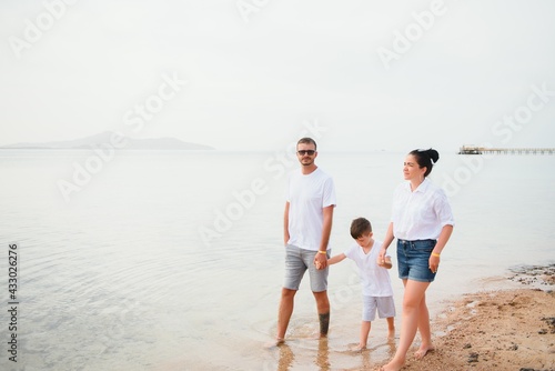 Cute happy family having fun on luxury tropical resort, mother with child, summer holidays, love concept
