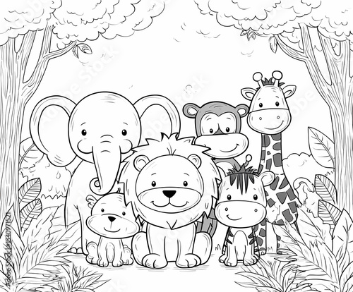 jungle, safari, wild animal, children, children, lion, elephant, giraffe, zebra, monkey, hippo, bear, tiger, forest, tree, leaf, cartoon, black-and-white, line art, drawing, doodle, savanna, wildlife, tropical, nature, animal kingdom, adventure, funny animals, foliage