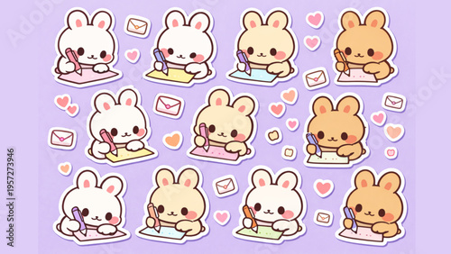 Cute Kawaii Bunnies Writing Letters and Sending Mail with Hearts, Adorable Sticker Design with Pastel Colors