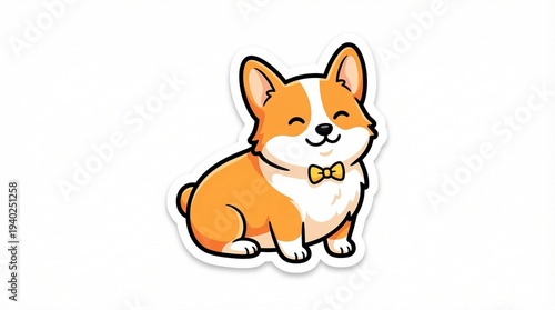 Cute kawaii corgi dog wearing a tiny yellow bowtie, happy sitting puppy character sticker art vector illustration isolated on white background