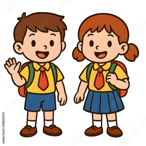 cartoon, student, school, uniform, cheerful, children, smiling, waving, learning, classroom, education, boy, girl, friends, happy, playful, backpack, children, elementary, primary, adventure, friendship, interaction, diversity, character, illustration, colourful, art, cute, fun, youth, joyful, teamwork, excitement, personality, gesture, enthusiasm, creative, character, young, graphic, bright