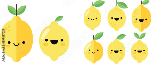 lemon, fruit, cute, character, smile, citrous, yellow, cartoon, food, fresh, healthy, summer, sweet, mascot, children, tropical, illustration, vector, flat, collection, isolated