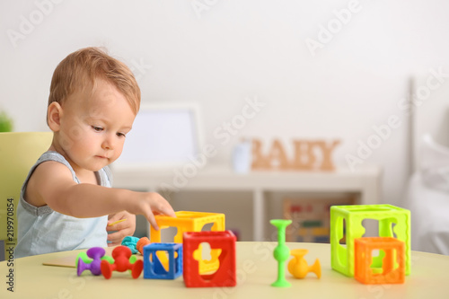 Cute little boy playing with toys at table indoors