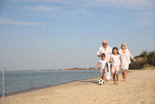 Cute little children with grandparents spending time together on sea beach