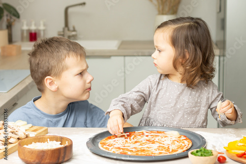Cute little girl 2-4 in gray dress and boy 7-10 in T-shirt cooking pizza together in kitchen. Brother and sister cooking