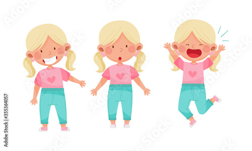 Cute Little Girl with Blonde Hair Demonstrating Different Gestures and Facial Expressions Vector Set