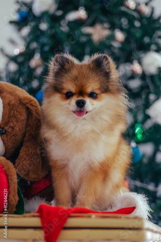 dog, pomeranian, pet, animal, spitz, cute, puppy, brown, canino, fluffy, small, breed, white, portrait, fur, adorable, isolated, pet, pom, animal, purebred, mammal, happy, orange, pedigreed, christmas, holiday, gift, santa, tree, christmas