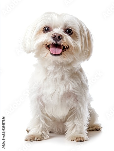 Cute Maltese dog panting, sitting and looking at the camera, Isolated on white , ai