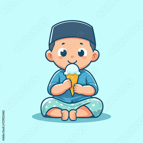 cute muslim boy sitting while eating ice cream cartoon vector illustration