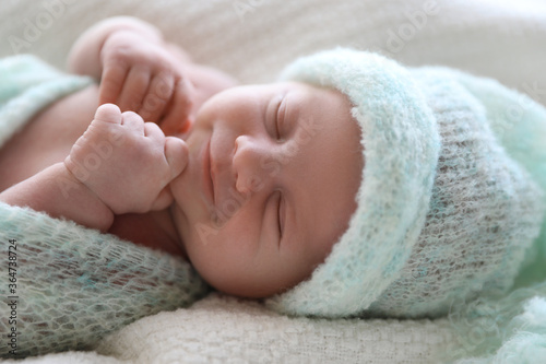 Cute newborn baby in warm hat lying on white plaid, closeup