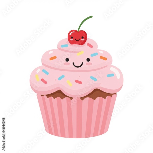 cupcake, pink, cherry, sprinkle, cute, cartoon, sweet, dessert, bakery, treat, food, illustration, happy, smiling, delicious, pastel, whipped, cream, frosting, confectionery, pastry, baking, sugar, party, celebration, joy, fun, colourful, adorable, charming, tasty, delightful, appetising, sweetness, cake, vanilla, chocolate