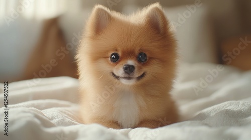 Cute Pomeranian Puppy Smiling on Soft Bed in Cozy Room