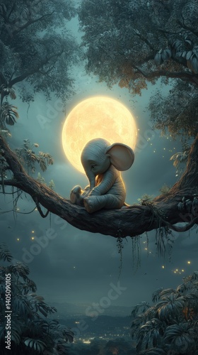 cute sad baby elephant sitting on tree branch against full moon background, cartoon illustration