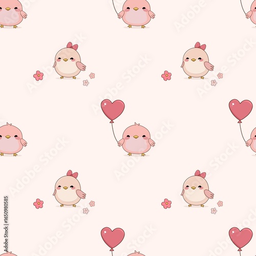 cute seamless pattern for Valentine's Day, Bird Couple with a heart-shaped balloon and flowers, pink background
