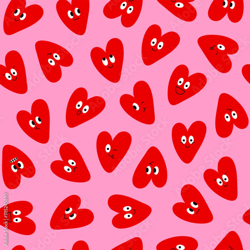 Cute seamless pattern with red hearts with character faces on a pink background. Trendy colorful illustration for kids. Vector hand drawn illustration