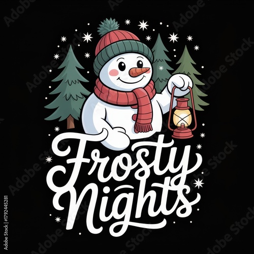 Cute Snowman Holding Lantern With Frosty Nights Text