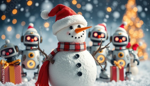 Cute snowman, wearing a red Santa hat and a striped scarf. The snowman has a cheerful face with sparkling eyes and a carrot-shaped nose. In the background, there is a Christmas tree decorated. robots