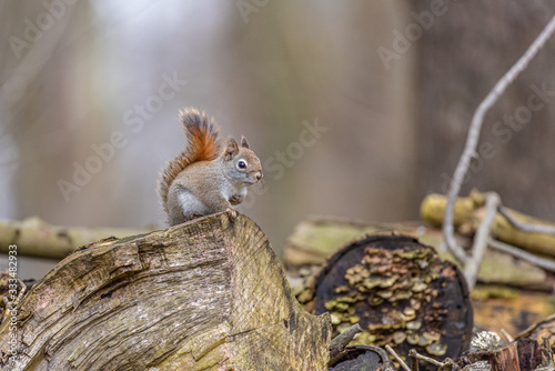 Cute squirrel with big eyes and bushy tail sitting on pile of logs in forest