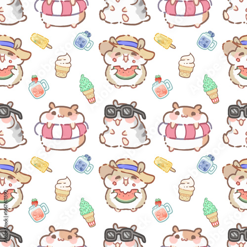 Cute Summer Hamster Seamless Pattern – Transparent PNG Background with Hamster, Floaties, Ice-cream, Sunglasses, watermelon, and Flowers, Smoothie, Popsicle.