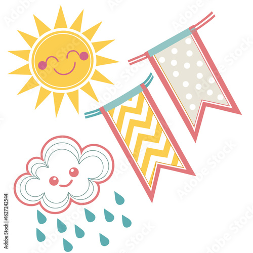sun, cloud, rain, banner, flag, decoration, weather, cute, cartoon, design, element, sky, happy, smile, face, graphic, drawing, art, clip art, symbol, nature, season, spring, summer, holiday, party, celebration, event, cheerful, bright, colours, pattern, polka, chevron, children