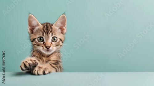 Cute tabby kitten with green eyes looking at camera on a blue background.