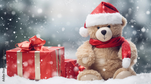 Cute Teddy Bear in Christmas Costume with Presents