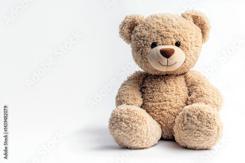 Cute teddy bear sits on a white background, conveying warmth, comfort, and childhood innocence.