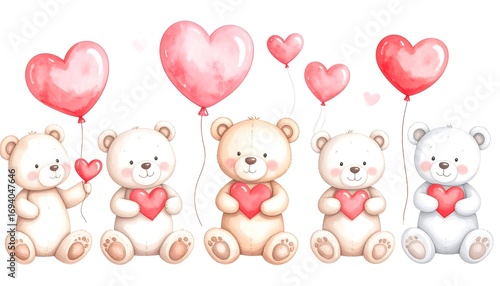 teddy, bear, nubes, balloon, pink, red, cute, watercolor, cartoon, children, adorable, valentine, love, sweet, whimsical, illustration, drawing, art, pastel, graphic, design, sitting, holding, gift, happy, collection
