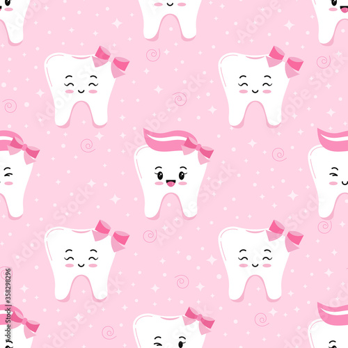 Cute tooth emoji girl seamless pattern. Tooth with bow, paste on head and sparkles vector kids print on pink background. Flat design cartoon kawaii style smiling emoji character endless texture.
