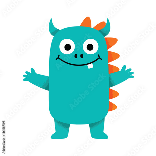 monster, cartoon, cute, friendly, turquoise, blue, cyan, teal, orange, spike, horn, fin, eye, large, round, smile, happy, joyful, grinning, arm, outstretched, welcoming, character, illustration, vector, fun, playful, whimsical, creature, beast, alien, mascot, adorable, chubby, body, leg, foot, mouth, teeth, vibrant, colourful, digital, graphic, design, fantasy, imaginary, children, toy