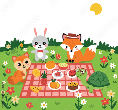 fox, rabbit, cat, turtle, picnic, fruit, dessert, grass, meadow, flower, sun, nature, animal, gathering, food, apple, orange, pineapple, watermelon, cake, party, blanket, green, summer, happy, cute, fun, garden, peaceful, friendship, holiday, recreation, wildlife, flora, fauna, eating, sitting, smiling, day, celebration, vector, illustration