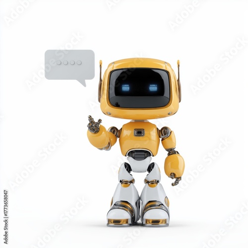robot, yellow, speech, bubble, gesture, cute, talking, android, technology, futuristic, digital, innovation, communication, interaction, character, cartoon, android, ai, artificial, intelligence, expression, friendly, adorable, small, mechanical, metal, modern, design, illustration, isolated, concept, white, background, display, screen, emotional, animated, glossy, metallic, interactive, expressive, autonomous, advanced