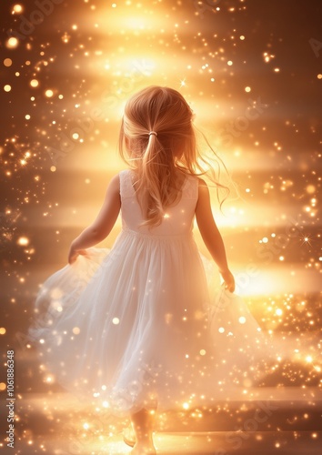 cute Young little girl with mysterious energy around her climbing stairs concept of blessing of angel daughter birth