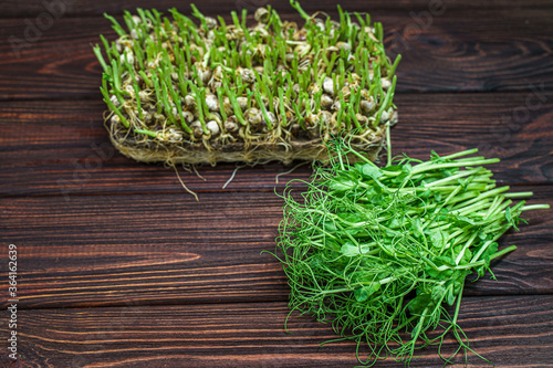 Cutted microgreen pea sprouts on old wooden table. Vegan and healthy eating concept. Growing sprouts.