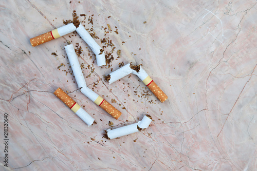 Cutting cigarettes on marble table, symbol of stop smoking campaign.