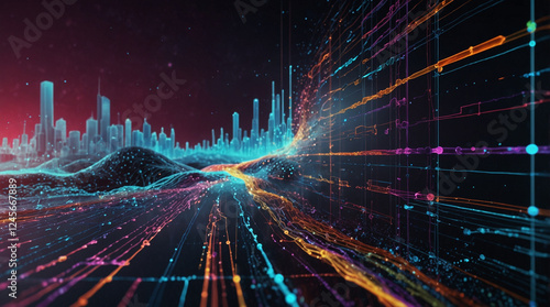 Cyber big data flow. Blockchain data fields. Network line connect stream. Concept of AI technology, digital communication, science research, 3D illustration music waves