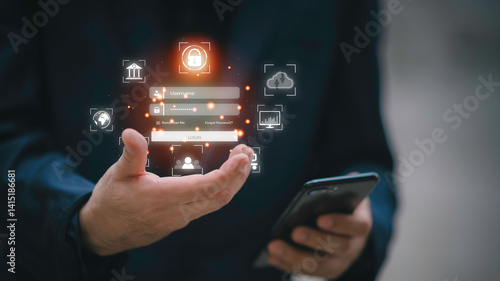Cyber security and Security password login online concept Hands typing and entering username and password of social media, logging in with smartphone to an online bank account, data protection hacker.