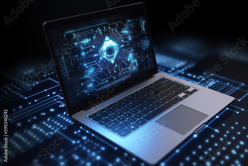 Cyber security, internet protection, digital data protection, internet safety, hacker safety, network safety, cyberspace, cyber crime, phishing, online safety, padlock on a laptop. Generative AI