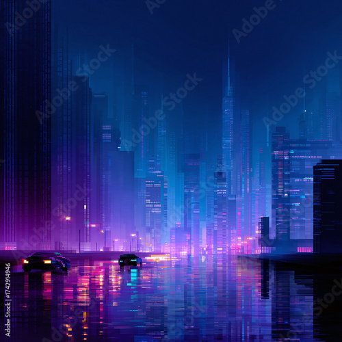 city, night, neon, light, urban, future, technology, wet, street, car, futuristic, landscape, building, architecture, dark, purple, blue, pixel, art, digital, scene, skyline, downtown, metropolis, modern, evening, traffic, transport, road, vehicle, abstract, illustration, design, glitch, style, retro, pixelated, graphic, structure, pattern, perspective, tall, nightlife