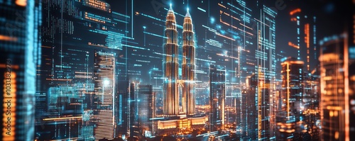 city landscape, night, skyscraper, urban, twin, tower, architecture, city, modern, metropolis, futuristic, digital, neon, light, glowing, bright, technology, virtual, reality, network, connection, datum, code, computer, programming, artificial, intelligence, cyberspace, art, abstract, graphic, design, illuminated, skyline, building, night time, landscape, background