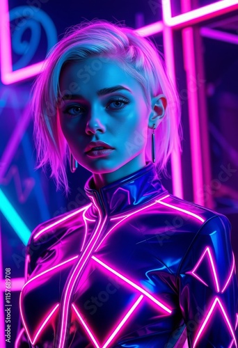 neon, futuristic, woman, portrait, glow, light, cyber, suit, geometric, electric, fashion, illuminated, vibrant, model, technology, cybernetic, style, outfit, pattern, energy, blue, pink, purple, modern, aglow, design, armoring, aesthetic